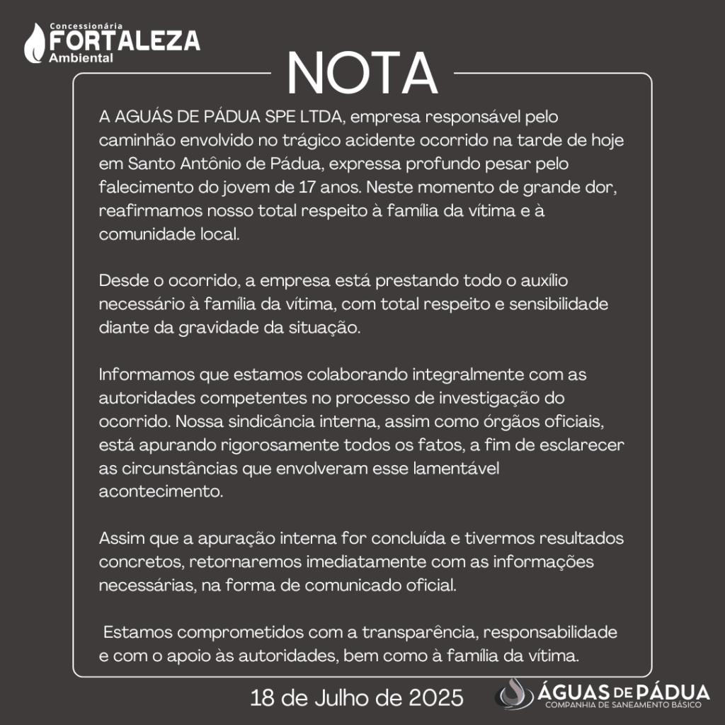 A AGUÁS DE PÁDUA SPE LTDA, empresa responsável pelo caminhão envolvido no trágico acidente ocorrido na tarde de hoje em Santo Antônio de Pádua, expressa profundo pesar pelo falecimento do jovem de 17 anos. Neste momento de grande dor, reafirmamos nosso total respeito à família da vítima e à comunidade local.
